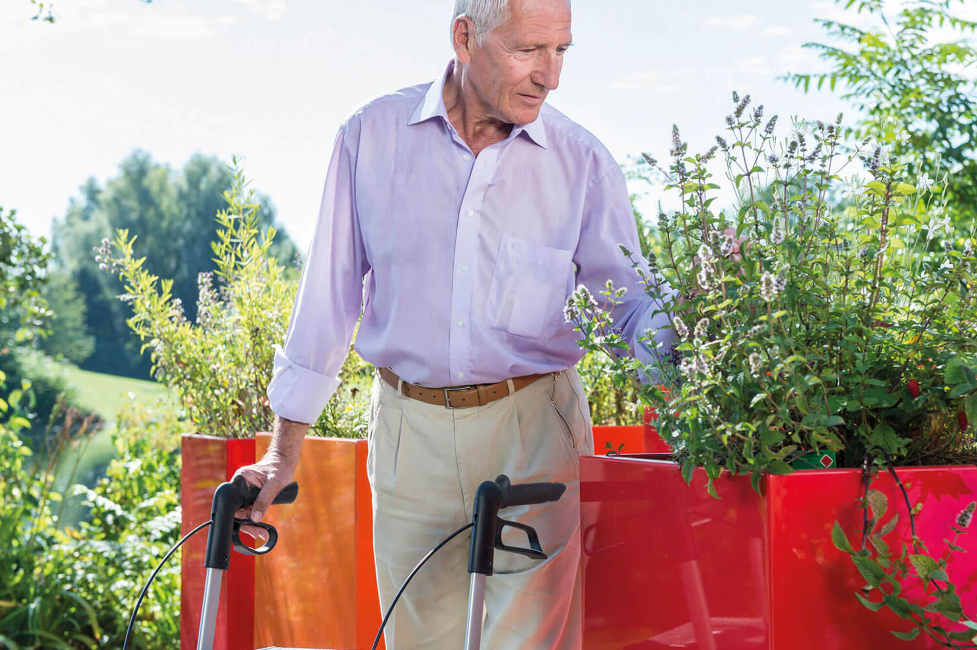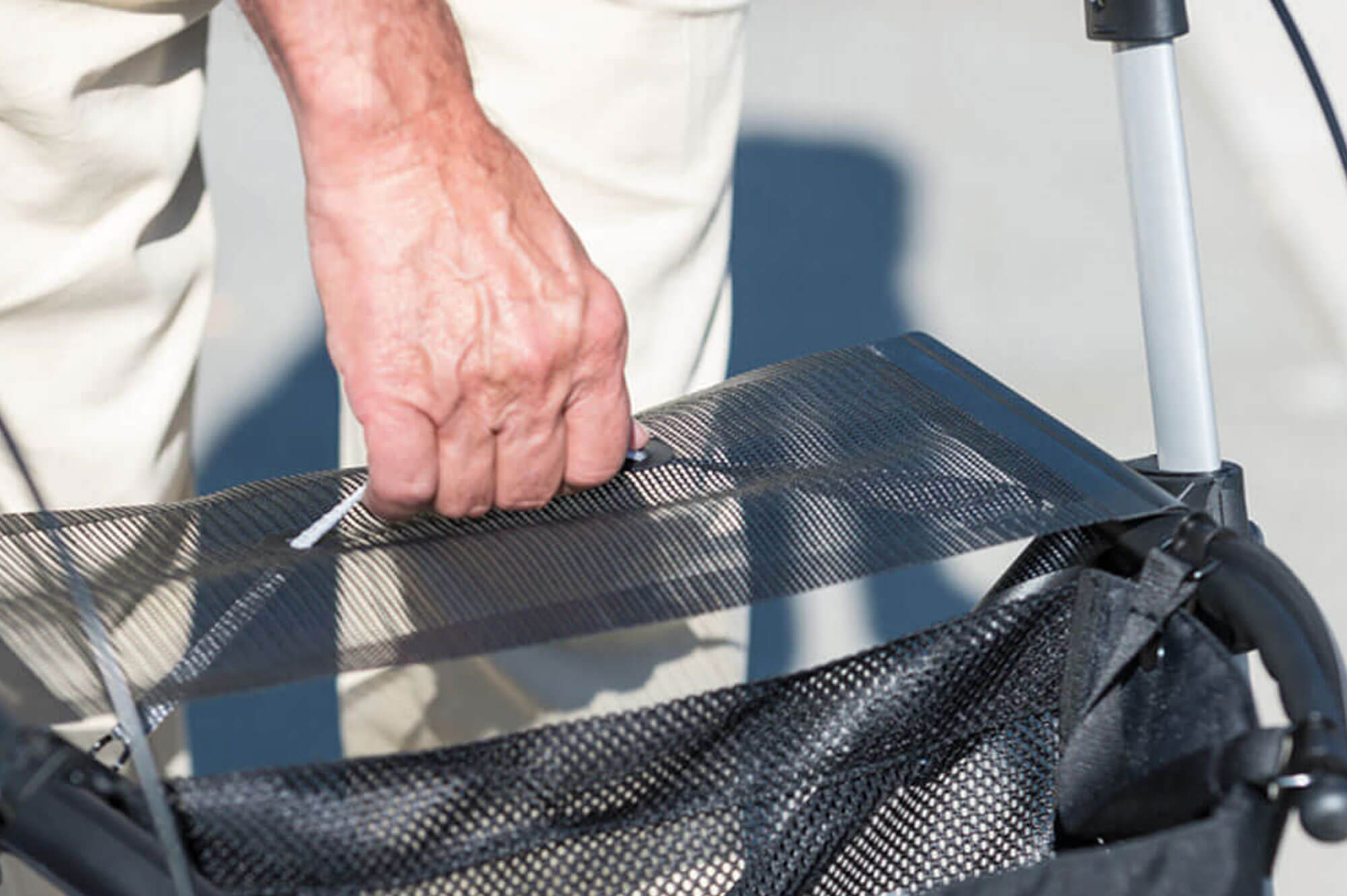 Comfortable walking, indoors and out – that’s what you can expect from this lightweight rollator. Easy to handle and highly manoeuvrable, even in folded position. Due to the height adjustment with memory function the push grips are always in the right position. And when it’s time for a break, you can sit safely on the spacious seat.