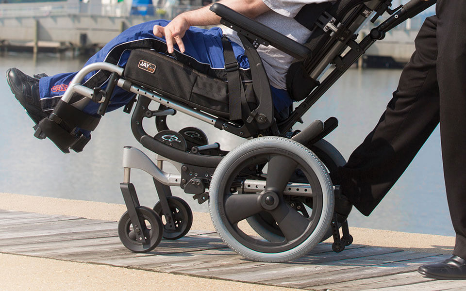 The IRIS is available with a wide variety of options to help you manage daily activities involving your child's care. For tilting without exposed cables, choose the Foot Release Tilt Actuator. The push-button hub locks located on the back canes are compact, easy to access, and easy to operate for any caregiver. Standard with the Height Adjustable backrest, the Angle Adjustable Stroller Handle has 260° of angle adjustability to fit varying caregiver heights and enable pushing from a tilted position.