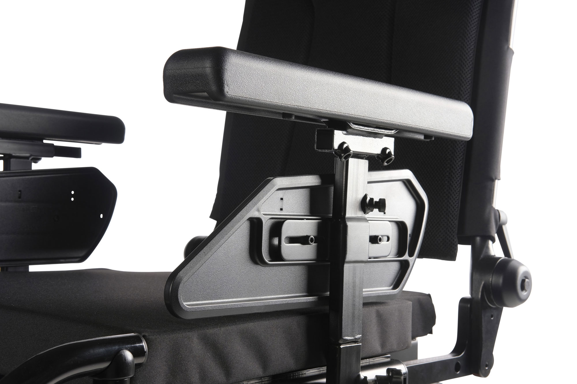 Different positioning elements are available like swing away lateral thoracic supports, thigh supports and knee supports. All of them are easily swing away and detachable. The integrated seat rail offers many options for mounting the different positioning elements.