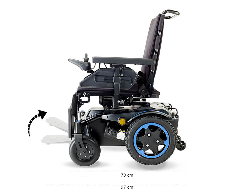 The legrests and controller can also swing outwards, so the Q100 R can get even-closer to objects like tables and chairs for an easier transfer in or out of your powered wheelchair.